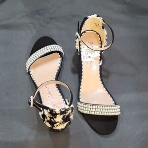 BRAND NEW BETSY JOHNSON LOW BLOCK-HEEL SANDAL SIZE 8 COLOR BLACK &WHITE ADJUSTABLE BUCKLE STRAP closure open toe double pearl studded strap and back strap closure made with fabrics upper sole material balance manmade 3"INCHESStep into style with the STONE bridal heel. Featuring a minimal design and thin straps, these heels will elevate your formal day look. Say yes to comfort and elegance!Satin textile upper material with stones Synthetic lining/sockvSynthetic Betsey Blue sole 2.5 inch heel height THIS ITEMS IS BRAND NEW WITH TAG NO BOX CHECK THE PICTURES