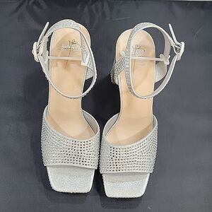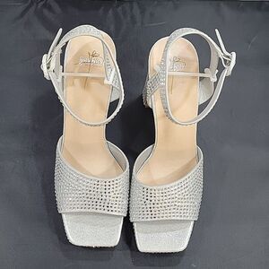 BRAND NEW BISSOU BISSOU JEWEL STUDDED EMBELLISHMENTS SQUARE TOE HIGH HELL SANDAL SIZE 91/2M COLOR GRAY&SILVER MADE WITH MAN-MADE UPPER TEXTILE MAN-MADE OUTSOLE. MATERIALS ADJUSTABLE BUCKLE CLOSURE SLIP-ON STYLE HELL HEIGHT MEASUREMENTS APPROXIMATELY 5"INCHED COVERED THIS ITEMS IS BRAND NEW WITH TAG AND BOX CHECK THE PICTURES ( FYI THE PICTURES IS JUST A MODEL TO SHOW WHAT THE SHOE LOOK ON CHECK THE PICTURES)