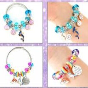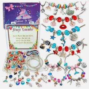 A BRAND NEW, unopened 2022 edition of Believe In Love's Bracelet Making Kit with unicorns, mermaids, and more! The kit includes glass and metal beads and charms for making bracelets and necklaces. Everything your little ones need to make beautiful jewelry with their friends all conveniently packed in a small compact case.