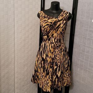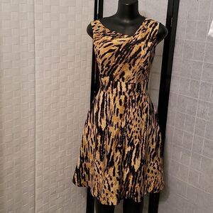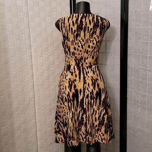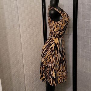 BRAND NEW CALVIN KLEIN SLEEVELESS LEOPARD PRINT MIDI WOMEN"S DRESS SIZE 2 COLOR TAN, BROWN, BLACK FEATURES HIDDEN BACK ZIPPER CLOSURE SLANTED V-NECK FIT &FLARE BODICE DESIGN PASS THE KNEE LENGTH MADE WITH SHELL 94%POLYESTER 6%SPANDEX LINING 100%POLYESTER THIS ITEMS IS BRAND NEW WITHOUT TAG CHECK THE PICTURES