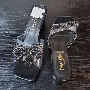BRAND NEW CHASE+CHLOE BOWNOT SLIP-ON STYLE WOMEN'S SANDAL SIZE 8.5WIDE WITHD COLOR BLACK &CLEAR STRAP SQUARE OPEN TOE MADE WITH ALL MAN-MADE MATERIAL LINING UPPER MAN-MADE MATERIAL HEEL HEIGHT MEASUREMENTS APPROXIMATELY 3.15"INCHED THIS ITEMS IS BRAND NEW WITH TAG NO BOX CHECK THE PICTURES