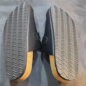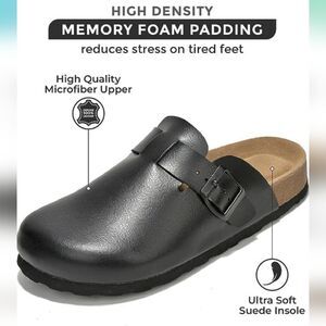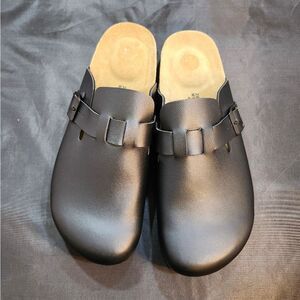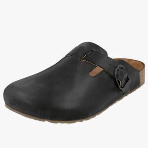 BRAND NEW CUSHIONAIRE HAZE LEATHER CLOGS MULES SLIPPERS SANDALS SIZE 11 COLOR BLACK Sole Rubber Width Normal Insole Leather Toe Cap Round Fit Normal Comfort Smooth comfort Occasion Casual Upper materia Nubuck Outer material Genuine leather Inner material Without lining Sole type non-slip Category Heel Height Flat & low [0-1 inch] Fastening Open Slip-on.With the comfortable Bio you are always good on foot. Both the upper and inner lining are made of genuine leather. In addition, the sole is also made of leather and features a wonderfully soft, anatomically shaped footbed that gently surrounds your foot with the slightly raised heel. Thanks to the adjustable buckle, the shoe width can be individually adjusted to your foot shape and the lightweight, outer rubber sole springs every step pleasant to wear Whether worn in the garden or as slippers, this shoe model is always the best choice Product details comfortable clog THIS ITEMS IS BRAND NEW WITH TAG AND BOX CHECK THE PICTURES