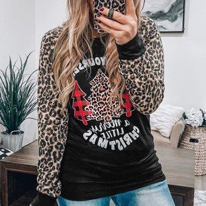Stunning Christmas Long-sleeve shirt with contrasting patterns. So amazingly cute & stylish. Leopard print sleeves and with matching leopard & trendy red and black plaid/buffalo check Christmas tree design. Reads "Have yourself a Merry Little Christmas". Perfect, stylish Christmas shirt for any Holiday fanatic. Soft, cozy & stretchable material (95%Polyester+5%Spandex). See attached size chart for measurements. Limited Stock. See size chart in pictures for measurements. From Smoke free home. Check out my other listings to bundle and SAVE on shipping costs. Boutique item/comes with plastic poly bag. ***Listing includes Christmas Shirt only-no photo props or accessories included***