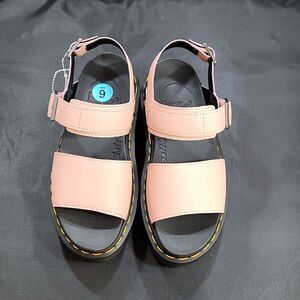 BRAND NEW DR MARTENS VOSS II ATHENA LEATHER STRAP PLATFORM SANDALS SIZE 6 COLOR PINK & BLACK BLACK PLATFORM Our 2-strap Voss II sandal ready for the height of summer. A sleek, minimalist design built with PU-coated Athena leather for a smooth soft finish. For those days out that spill into a night out. Towering on a 3 inch Quad Zebrilus sole, for maximum elevation with minimum weight. 2 gunmetal buckles on the ankle provide for a secure and comfortable fit. Finished with our signature yellow welt stitch.Athena is a smooth PU coated leather with a matte finish