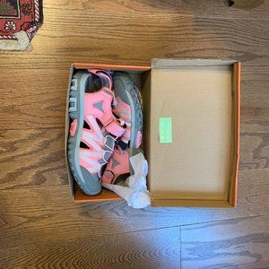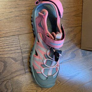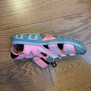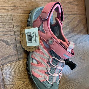 These DREAM PAIR sandals are closed toe shoes to protect your child's feet. They are the perfect addition for summer and spring, and are a size six big kid. These pink and gray sandals are beautiful, water friendly, quick drying, have cushioned soles, and have many more features.