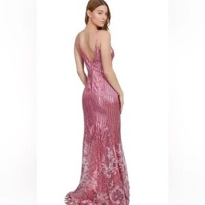 Make an entrance in this stunning pink sequin gown. Perfect for prom, formal events, or any special night where you want to shine. Features a flattering fitted silhouette, deep V-neckline, high leg slit, and intricate sequin floral detailing that catches the light beautifully. A true showstopper!