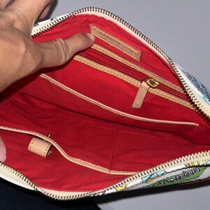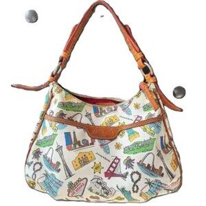 Dooney Bourke Americana landscapes purse curved shoulder bag Featuring illustrations of famous landmarks size as the welcome to Las Vegas sign, the statue of liberty, Mount Rushmore, Golden Gate Bridge, space needle, St. Louis gateway arch, Hollywood sign etc The front has another large pocket with a magnetic closure and another nice sized zippered pocket in the rear.