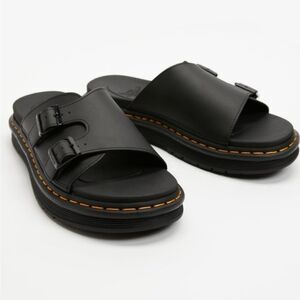 BRAND NEW Dr. MARTENS Unisex DAX SLIDE HYDRO B SANDAL SIZE 8 COLOR BLACK Care Instruction Wipe with Dry Cloth Origin Imported Sole Material Synthetic Rubber Outer MaterialPolyurethane Hydro is a smooth PU-coated leather with a matte finish. Clean by wiping with a damp cloth Two adjustable straps Retains classic Docs DNA: grooved edges and visible welt stitching Description Sandals. Re-engineered. Dr. Martens Dax men's sandal is built from tough hydro leather and welted on a rugged AirWair sole. So whether you’re stomping through the fields or kicking back this summer, they’re ready to take on anything. Marked by DM's unmistakable yellow stitching, the slide sandals have a wider fit and molded footbed for maximum comfort.Designed for summer. Handcrafted in England.
