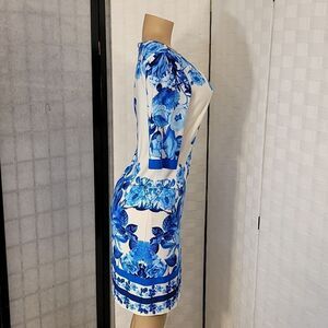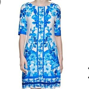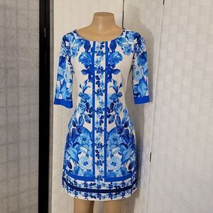 BRAND NEW ELIZA J T BODY DRESS BOARDER DETAIL DRESS SIZE 10 COLOR WHITE & ROYAL BLUE A china-print dress with a border detail that can change your whole look! A flattering sheath silhouette, three-quarter sleeves and a hem that hits above the knee.