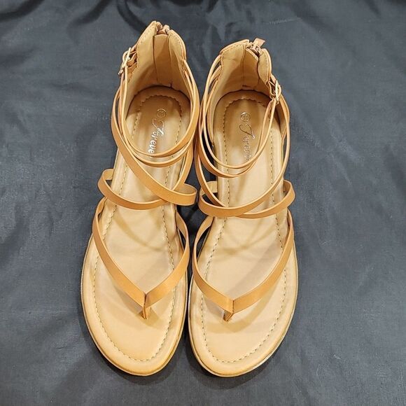 BRAND NEW FOREVER CHEERFUL-77 SOLID GLADIATOR FLAT BACK ZIPPER SANDAL SIZE 10 COLOR TAN Upper made of man-made material with detail. Zipper closure at heel and buckle closure at ankle. Lightly cushioned, stationed insole. Round toe with breathable construction. Man-made lining. Man-made sole. ImportedFeatures multi-strap design