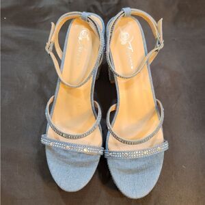 BRAND NEW FOREVER DENIN BLOCK HEEL VERSATILE STUDDED WITH PEARL SANDAL. SIZE 61/2 COLOR BLUE DENIM MADE WITH ALL MAN-MADE MATERIAL LINING UPPER SYNTHETIC SOLE MATERIAL heels can add a stylish and versatile touch to your outfit, offering a chic blend of casual and classy.True Size multi Strap Open Toe this womens sandal with featuring adjustable buckle closure round toe shape Description for an elegantly embellished summer look with a slim double strap upper, elevated with an oversized block heel.heeled sandals Approx. 3.75" platform puff block heelSleek strap details THIS ITEMS IS BRAND NEW WITH TAG NO BOX CHECK THE PICTURES