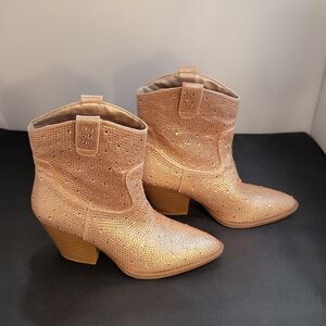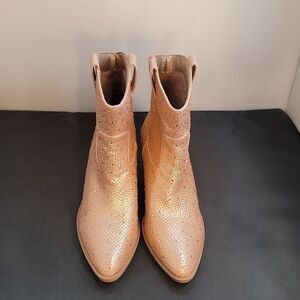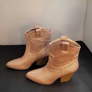 BRAND NEW FOREVER GLITZY RHINESTONE WESTERN BOOTIES SIZE 9 COLOR PEACH Step out and sparkle in these glitzy rhinestones embellished western booties! They feature and above-the-ankle design with a pointed toe, a low stacked block heel, and all-over rhinestone embellishments for a gorgeous shine. Style with a corset top and a faux leather skirt. Fit & Features Above-the-ankle design Pointed toe Low stacked Rhinestone embellishments Faux leather material Western-inspired design heel height measurements apron 3"inched THIS ITEM IS BRAND NEW WITH TAG NO BOX CHECK THE PICTURES