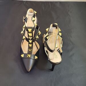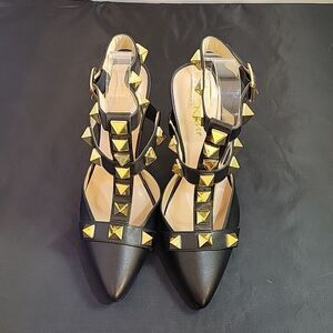 BRAND NEW FOREVER POINTED TOE HIGH HEEL STILETTOS GOLD STUDDED ANKLE STRAP SHOE SIZE 71/2 COLOR BLACK &GOLD STUDDED EMBELLISHMENTS DESIGN FASTENING GOLD PYRAMID STUD ANKLE STRAP GOLD ADJUSTABLE BUCKLE MADE WITH ALL MAN MADE MATERIALS HEEL HEIGHT MEASUREMENTS APPROX 4.25"INCHED THIS ITEMS IS BRAND NEW WITH TAG AND BOX CHECK THE PICTURES