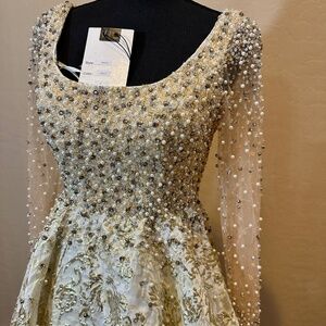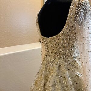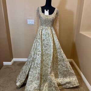BRAND NEW GOLD MAC DUGGAL BALLGOWN A LINE DRESS WITH PEARLS AND RHINESTONES