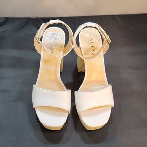 BRAND NEW GUESS PLATFORM BLOCK HEEL OPEN TOE SANDAL SIZE 8M COLOR WHITE MADE WITH ALL MAN-MADE MATERIALS LINING BALANCE MAN MADE CUSHIONED FOOTBED INSOLE ESPADRILLE ADJUSTABLE BUCKLE ANKLE CLOSURE HEEL HEIGHT MEASUREMENTS APPROX 5"INCHES THIS ITEMS IS BRAND NEW WITH TAG NO BOX CHECK THE PICTURES