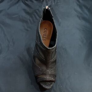 BRAND NEW GUESS WOMEN'S SEXY LACE GLITTER OPEN TOE ZIPPER HIGH HEEL SHOES SIZE 9M COLOR GLITTER& BLACK MADE WITH MAN MADE TEXTILE UPPER LINING OUTSOLE CUSHIONED FOOTBED,BACK ZIPPER CLOSURE,PEEP TOE,MESH MATERIAL HEEL HEIGHTS MEASUREMENT APPROX 4"INCHED THIS ITEMS IS BRAND NEW WITH TAG CHECK THE PICTURE