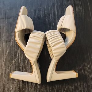 BRAND NEW H&M MULES IMITATION LEATHER OPEN TOE SANDAL SIZE 6M COLOR CREAM Mules in imitation leather with open toes, gathered straps and wide, covered heels. Imitation leather linings and insoles. Heel 8 cm Heel Height High heel Footwear Style Mules, Heeled Composition Outer sole Thermoplastic rubber 100% Linings Imitation Leather 100% Upper Imitation Leather 100% Material: PU Materials in this product explained Thermoplastic rubberThermoplastic rubber (TPR) is a synthetic rubber made from a type of polymer (a fossil resource). It has the characteristics of both rubber and plastic.THIS ITEMS IS BRAND NEW WITHOUT TAG CHECK THE PICTURES