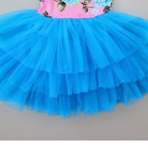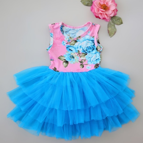 BLUE LAYERED BOTTOM... PINK FLORAL TOP.... TODDLER/GIRLS TUTU DRESS. BRAND NEW STILL IN PACKAGE. SIZE 4-5. Perfect dress for any occasion!!