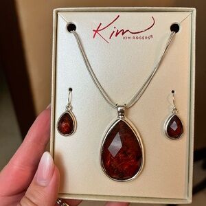 Stylish Kim Rogers necklace with a silver colored chain with bold pendant in a gorgeous brown color with reddish orange undertones, and matching pierced earrings. Ideal for enhancing any ensemble. Perfect color for Fall!