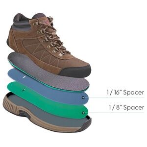 Adjustable fit - Two sets of removable spacers (1/16" and 1/8" thick). - Allow the adjustment of the space inside the shoe for a perfect fit.