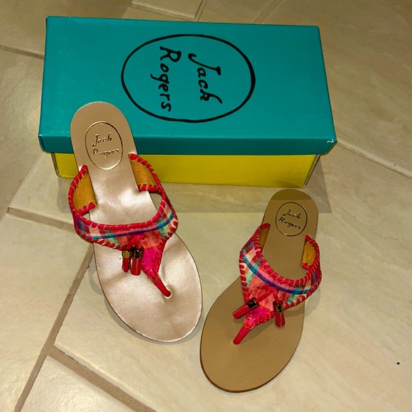 The cutest preppy plaid sandals. Brand new with box never worn. Too small when they arrived. Bought from Bloomingdale’s. Gorgeous piece. Jack Rogers Alana Pink Plaid Thong Slide Tassel Sandal, Easy slip on and off. Whipstitched pink leather trim. Swingy logo-stamped tassels with JR logo.
