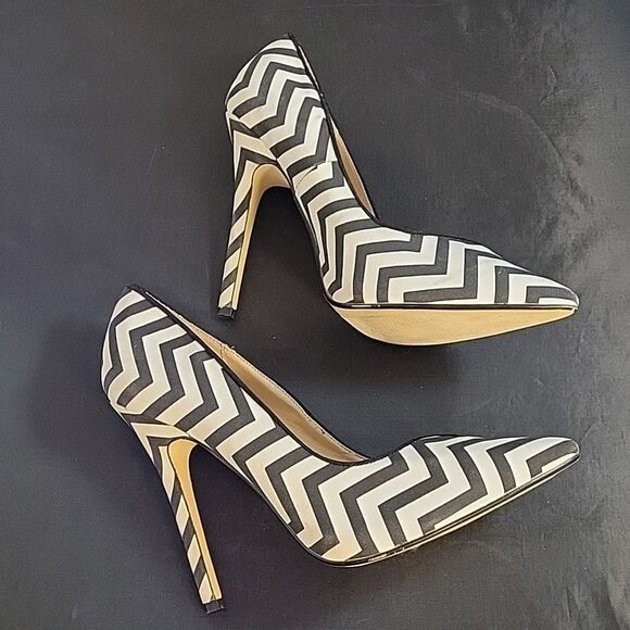 BRAND NEW JUSTFAB HIGH HEEL STILETTOS V-CUTOUT POINTED TOE WOMEN"S SHOE SIZE 11 COLOR BLACK &WHITE Style it flirty in Francine, a printed pump with contrast piping, a hidden platform, and a chic V-cutout at the vamp. Choose black multi for chevron stripes and black piping, Fabric upper textile inner lining sock man made outsole man made Shoe Details Approx. Heel Height: 4" Approx. Platform Height: N/A Synthetic Upper Man Made Sole THIS ITEMS BRAND NEW WITHOUT TAG OR BOX CHECK THE PICTURES (FYI THIS ITEMS HAVE A SMALL DAMAGE IN THE INSOLE OF THE SHOE CHECK THE PICTURES)