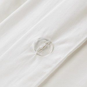 This set includes a duvet cover and two shams, which are crafted from 100% cotton in an ivory color. The set is brand new and has not been removed from its original packaging. The set is machine washable, hypoallergenic and has button closures!