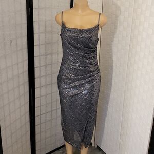 BRAND NEW LAUNDRY by SHELLI SEGAL CROWL NECK SLEEVELESS SEQUIN DRESS SIZE 10 COLOR DARK GRAY sequin embellishment front split lined side 95% polyester 5% elastane lining 100% polyester adjustable straps Put on a show in ours silver sequin dress This a gunmetal side bo ing detail ruched accent and tulip hem center back zipper closure piece is feminine perfection with it stunning sequin-embellished fabrication and draped neckline ruching that flatters your curves. For an unforgettable look this season, MATERIALS THIS ITEMS IS BRAND NEW WITH TAG CHECK THE PICTURES