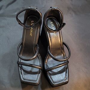 BRAND NEW LILIANA STRAPPY CAGED WEDGE HEELS SANDAL SIZE 10 COLOR BLACK A pair of faux leather wedge heels featuring a strappy design, adjustable ankle strap, open square toe, and platform. Content + Care Padded insole, textured outsole Upper, Outsole, & Insole 100% polyurethane Other contents: 100% rubber Heel height 5.25" Platform 2"inched THIS ITEMS IS BRAND NEW WITH TAG NO BOX CHECK THE PICTURES