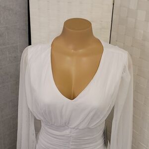 BRAND NEW LOVE X DESIGN RUCHED BODYCON LONG SLEEVE V NECK MINI  COCKTAIL DRESS SIZE LARGE COLOR WHITE Fabrics The ruched bodycon mini dress is very soft and comfortable, Lightweight, skin-friendly, has a elasticity, made of double layers fabric, not see through Feature The bodycon long sleeve dress features deep V neck, tight, mini length, slim fit, low cut, lantern sleeve design add elegant and fashion. Ruched details perfectly embrace the curves of your body, fully show your charm. This short dress is a date night must-have little black dress. Feature:wrap style,below knee,long sleeves, ruched detail, deep v neck, slim fit, simple classic.V-neck ruched midi dress reveal beautiful collarbones, hide belly fat, perfectly highlight curves, and make you look slimmer and more beautiful THIS ITEMS IS BRAND NEW WITH TAG CHECK THE PICTURES (FYI, THE FIRST PICTURES IS JUST A MODEL TO SHOW WHAT THE DRESS LOOK ON CHECK THE PICTURES)