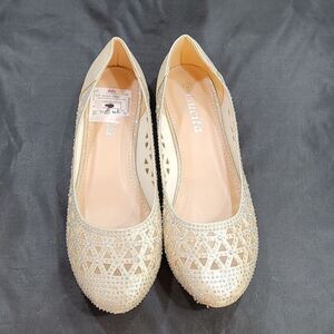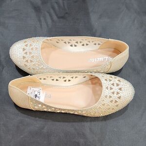 BRAND NEW LUCITA ROUND TOE CUTOUT DESIGN STUDDED EMBELLISHMENTS FLAT SIZE 8 COLOR SILVER Features a stylish perforated upper w/ jewel accents Cushioned insole Rubber sole bottom Metallic Laser-Cut Rhinestone THIS ITEMS IS BRAND NEW WITH TAG CHECK THE PICTURES