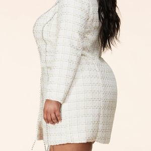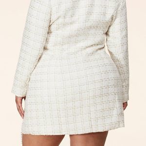LAST ONE! I WILL NO LONGER RESTOCK THIS STYLE! ALL LATISTE BY AMY STYLES COMES DIRECT FROM LATISTE BY AMY!! Ivory tweed blazer short dress features weaved gold-tone thread details, crystal rhinestone strips along the silhouette that cascade along the hemline, double breasted front with musical note detail buttons and dual front flap pockets. Full lining Front button closure Self: 95% Polyester, 5% Spandex Lining: 96% Polyester, 4% Spandex Length 35.5" ARM PIT TO ARM PIT 22” ACROSS FRONT LAYING FLAT Length approximately 34” long Waist approximately 21” (42”) Hips approximately 22” (44”) Model is 5' 10" and is wearing a size 1X