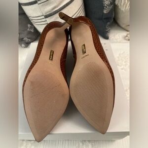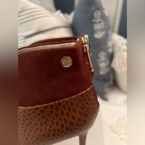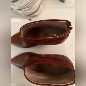 Never worn- brown pointed toe bootie with croc embossed texture with suede ankle. Gold accents and back zippers. (BIN16)