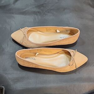 BRAND NEW MERONA BOWNOT POINTED TOE WOMEN'S FLAT SHOE SIZE 61/2W COLOR TAN MADE WITH Leather upper and lining comfort technology with comfortable footbed. Dual-layer high-density memory foam for arch support Cushions footbed insole Pointed toe design. Pressure-reducing heel cookie.No-slip rubber outsole textile upper textile with man-made material outsole THIS ITEMS IS BRAND NEW WITH TAG AND BOX CHECK THE PICTURES