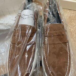 Never worn (not my husband's style). Still in box and wrapping! Size 12 Mens tan slip on loafers.