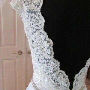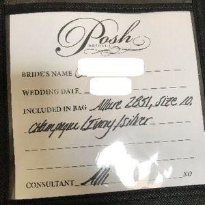 This wedding gown was originally purchased brand new from Posh Bridal (www.poshmn.com) for $1,200. It was never worn. Tags are still attached and no alterations were made. "A-line lace wedding dress with a scalloped lace v-neckline. A crystal beaded belt accents the entire natural waist of the dress and sits on top of the layered flowy tulle skirt. The dress features a low v-back with scalloped lace detailing, covered buttons over the zipper and a chapel length train. Bridal gowns are made to accommodate alterations and can typically be taken in 2-4 sizes and let out 1-2."