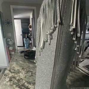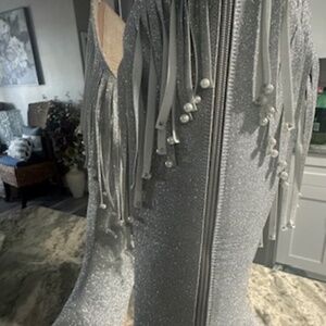 These brand new sexy sparkly silver cut out fringe boots are a stylish Western-inspired pair of mid-calf boots designed for women. With a high block heel and a comfortable synthetic lining and insole, these boots are perfect for adding a touch of glam to any outfit. The rubber outsole provides durability and stability, making these boots a fashionable and practical choice for any woman's shoe collection!