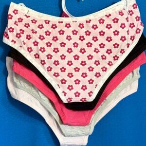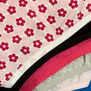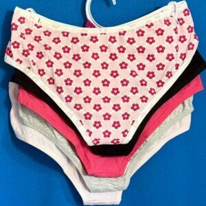 THIS IS A 5 PACK OF SUPER SOFT 95% BREATHABLE COTTON MATERIAL PANTIES THAT ALSO HAVE 5% ELASTANE SO THEY HAVE STRETCH & ARE SUPER COMFY! THESE ARE A SIZE L / LARGE & ALL 5 PAIRS OF UNDERWEAR HAVE A DIFFERENT COLOR / DESIGN TYPE INCLUDING A PINK & WHITE FLORAL DESIGN PLUS A LIGHT PINK WITH A SMILEY FACE THAT SAYS HAPPY VIBES & ALSO SOLID COLORS INCLUDING BLACK & BRIGHT PINK & ALSO A GREY GRAY TYPE COLOR & THESE HAVE A $40.00 RETAIL AS SHOWN ON THE TAG SO YOU'LL DEFINITELY WANT TO GRAB THESE UP BEFORE THEY'RE GONE!