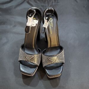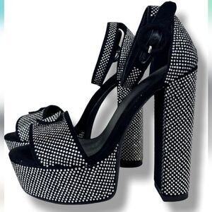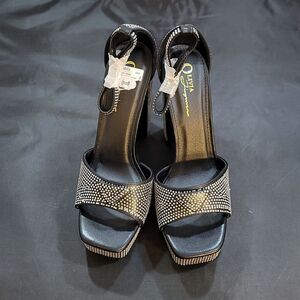BRAND NEW OLIVIA JOHNSON CHUNKY PLATFORM ANKLE HIGH HEELED SANDALS SIZE 9 COLOR BLACK &SILVER METALLIC EMBELLISHMENTS STUDDED open toe Adjustable ankle strap buckle closure Heel the 1.5 inched platform heel height measurements approximately approximately 5".00 inched Outer material Suede Closure type Slip On% enhance support, carefully tested, the structure is comfortable and stable. Ootd Tips Easy to pull on, black ankle sandals. all man-made materials lining upper balance textile upper man-made sole This platform sandals is very perfect for matching your wearing. You can wear this pumps in Party, Prom, Dance, Evening, Club, Date, Business, Snow, Professional, Performance, Formal, Bridal, Wedding, Casual, Travel, Hiking, or Office etc.Design The sexy shoe name is Black Rhinestone Platform Chunky. This platform chunky summer bootie is a classic stylish sexy cut that creates a special style.original design and all by handmade. We select high-quality synthetic leather. Platform THIS ITEM IS BRAND NEW WITH TAG NO BOX CHECK THE PICTURES