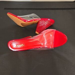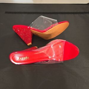 BRAND NEW PAZZLE RHINESTONE HEEL EMBROIDERED CLEAR OPEN-TOE STRAP SANDAL SIZE 8.5 COLOR RED&CLEAR STRAPStep into style with these trending clear high heels, perfect to dress up or down.Clear plastic upper heel height measurements approximately 4-inch clear wedge heel all man-made materials THIS ITEMS IS BRAND NEW WITH TAG AND BOX CHECK THE PICTURES
