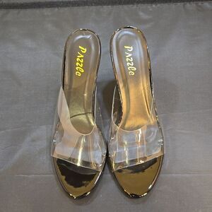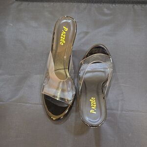 BRAND NEW PAZZLE RHINESTONE HEEL EMBROIDERED CLEAR OPEN-TOE STRAP SANDAL SIZE 9 COLOR BLACK&CLEAR STRAPStep into style with these trending clear high heels, perfect to dress up or down.Clear plastic upper heel height measurements approximately 4-inch clear wedge heel all man-made materials THIS ITEMS IS BRAND NEW WITH TAG AND BOX CHECK THE PICTURES