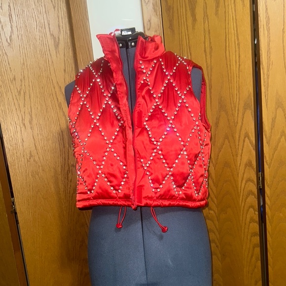 Vibrant red quilted vest featuring a stylish studded pattern. Perfect for adding a bold touch to any outfit.