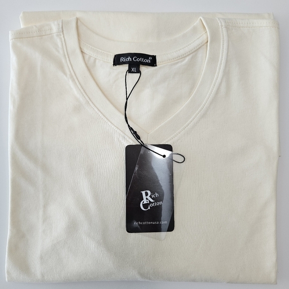 This cream colored men's v neck t-shirt (label says off white) offers a slightly more lose fit than a slim fit tshirt. This regular fit tshirt is perfect for casual daily wear. Show off your style with this high-quality regular fit T-Shirt.