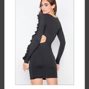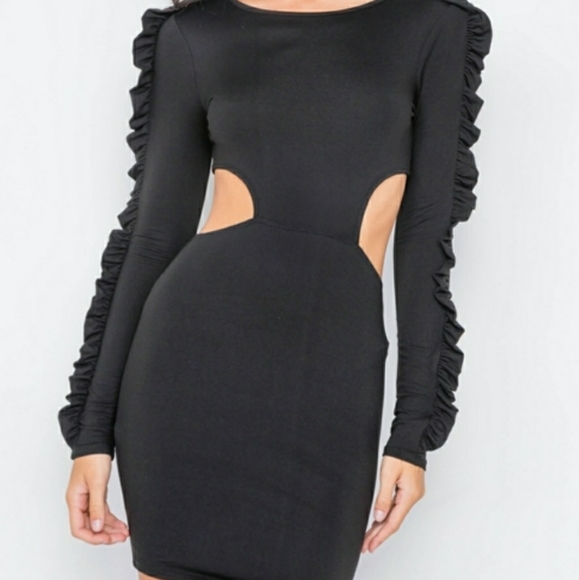 Black bodycon dress with textured ruffle sleeves and mini side cutouts.... sexy but not too revealing. .