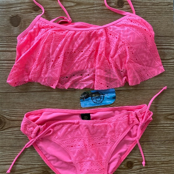 Bathing suit is NWT. Tie closure on the bottoms and the top Includes moulded, removable cups and adjustable straps.