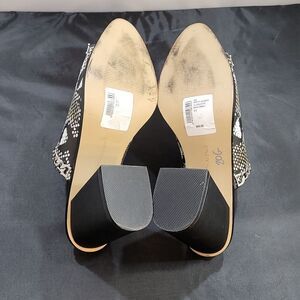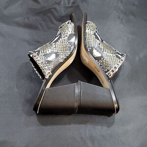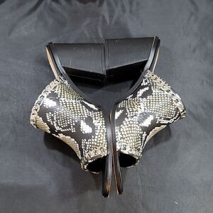BRAND NEW SAKS FIFTH AVENUE COLLECTION LEATHER SANDALS 91/2M COLOR BLACK, WHITE, OLIVIA GREEN AND MORE MADE WITH LEATHER UPPER MAN-MADE LINING DOUBLURE SYNTHETIQUE MAN-MADE SOLE MATERIAL Python snake print leather peep toe mules from Saks Fifth Avenue. Upper adorned with a silver chain, thick black leather wrapped with a high 8.9 cm heel. Minimal wear. The bottom of the sole is barely scuffed, very light scratches on the inside of the right heel of the shoe, a slight hairline crack in the middle of the right vamp of the shoe THIS ITEMS IS BRAND NEW WITH TAG CHECK THE PICTURES