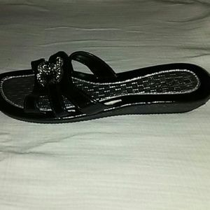 Dressy black and silver sandals with encrusted emblem on the front. Never worn. (Very slight heel) Runs small. Fits more like a 6.
