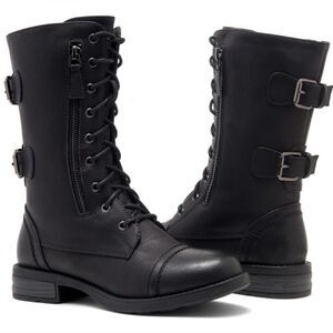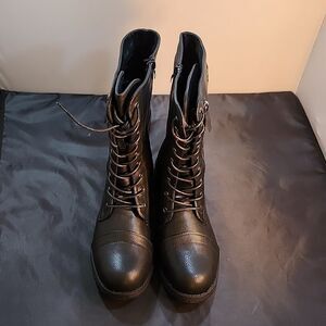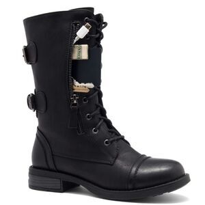 BRAND NEW SHOE LAND KASEY WOMEN'S ANKLE LACE UP MILITARY COMBAT MID CALF CREDIT CARD MONEY WALLET  POCKET BOOT SIZE 10 COLOR BLACK made with 100% Synthetic Imported Rubber sole Shaft measures approximately 8.5" from arch Platform measures approximately 0.50"boot  opening measures approximately 9" around Synthetic,Rubber sole. Heel Height: 1.25", Platform Measures: 0.5"(approx).Shaft measures approximately 9.75" from arch TRAVEL LIGHT WITH EASE 3-inch by 3.5-inch zippered (Pocket zipper only go down half way)storage pocket gives you a place to stow your cash, credit cards, pocket knife, keys and other small essentialsMilitary-inspired combat boot with built in pocket wallet for keys, credit cards and cash COMFORT ASSURED Padded insole cushions your foot as you walk. lace-up front allow you to adjust the fit for optimal support UGGEDLY CRAFTED -- Women's Military Combat Boots, you can easily walk on all types of terrains.The slip-resistant rubber sole has a special traction grip that will keep you on your feet on slippery floors, icy sidewalks and loose gravel THIS ITEMS IS BRAND NEW WITH TAG NO BOX CHECK THE PICTURES