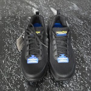 BRAND NEW SKECHERS GOODYEAR WOMEN'S ROGUE SLIP RESISTANT SHOES SIZE 10 COLOR BLACK Stride with confidence anywhere with Goodyear and sure-footed comfort with Goodyear Engineered by Skechers Rogue shoe. This women's casual and sporty slip-resistant design features a black mesh upper with synthetic overlays and a lace-up front closure, Die Cut Skechers Memory Foam cushioned insole, shock-absorbing midsole and a durable rubber high-traction outsole. THIS ITEM IS BRAND NEW WITH TAG AND BOX CHECK THE PICTURES