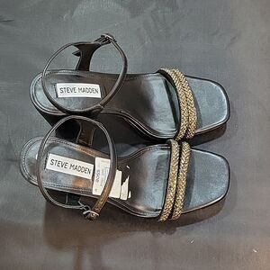 BRAND NEW STEVE MADDEN DOUBLE STRAP OPEN SQUARE TOE WOMEN"S SANDAL SIZE 8M COLOR BLACK WITH SILVER STUDS ADJUSTABLE BUCKLE STRAP CLOSURE MADE WITH ALL MAN-MADE MATERIALS LINING BALANCE MAN MADE CUSHIONED FOOTBED INSOLE HEEL HEIGHT MEASUREMENTS APPROX 4"INCHES THIS ITEMS IS BRAND NEW WITH TAG NO BOX CHECK THE PICTURES